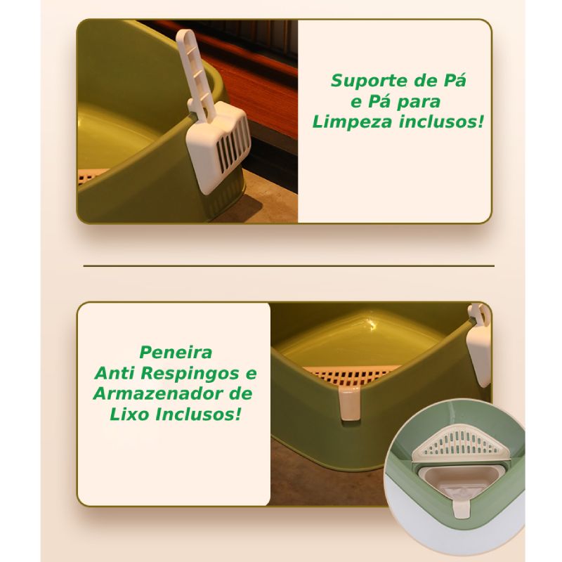 Feita com polímero de alta densidade, esta caixa oferece resistência e durabilidade excepcionais. Inclui um suporte com pá para limpeza, além de uma grade anti respingos para manter o ambiente sempre limpo e organizado. Uma escolha prática e eficiente para o cuidado do seu gato!