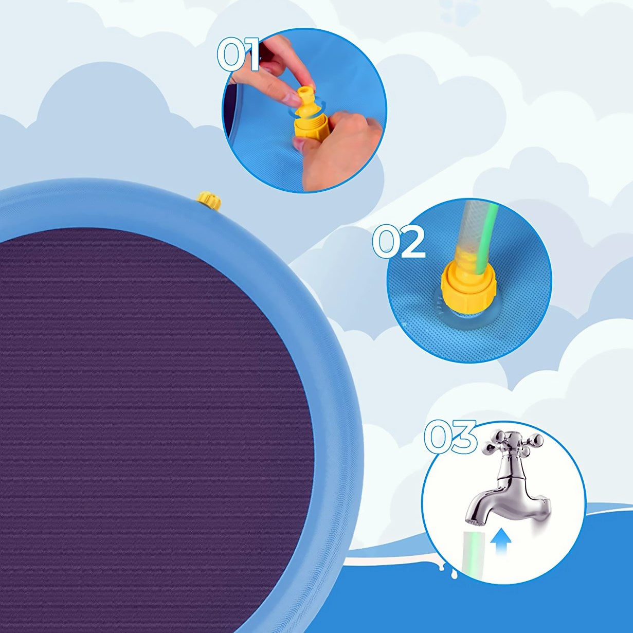 Simples: conecte a piscina à mangueira ou tubo de PVC, ajuste a pressão para altura desejada. Dobrável para economizar espaço quando não em uso.